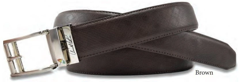 One Size Cut to Fit. 35mm cut to size, argyle pin-dot featheredge belt with click buckle with screen print Arnold Palmer logo.